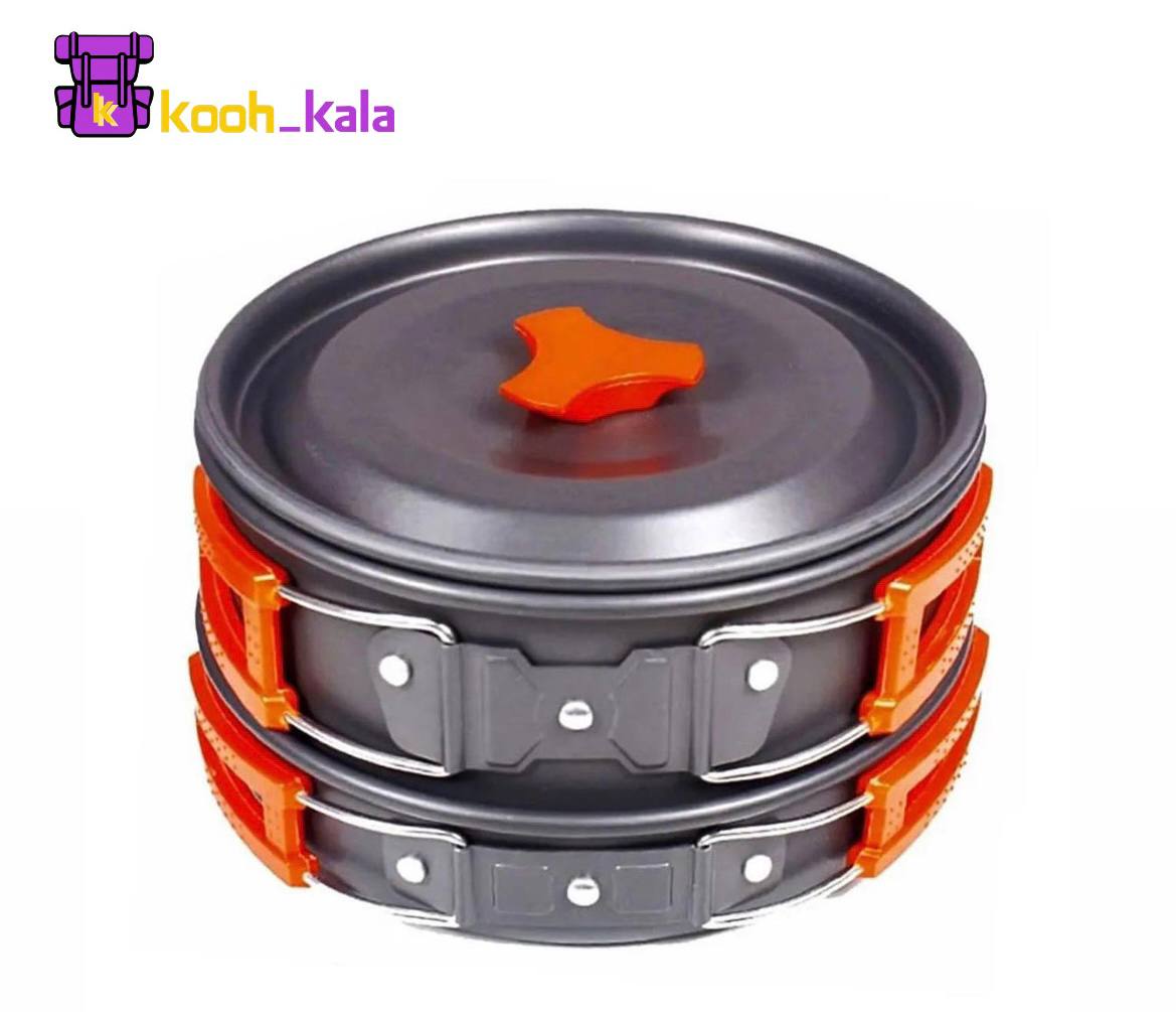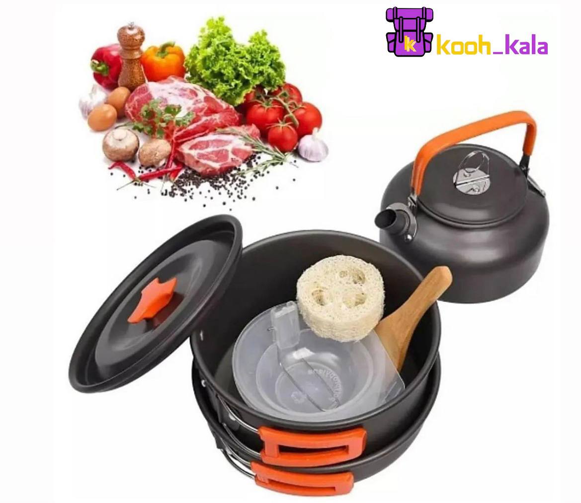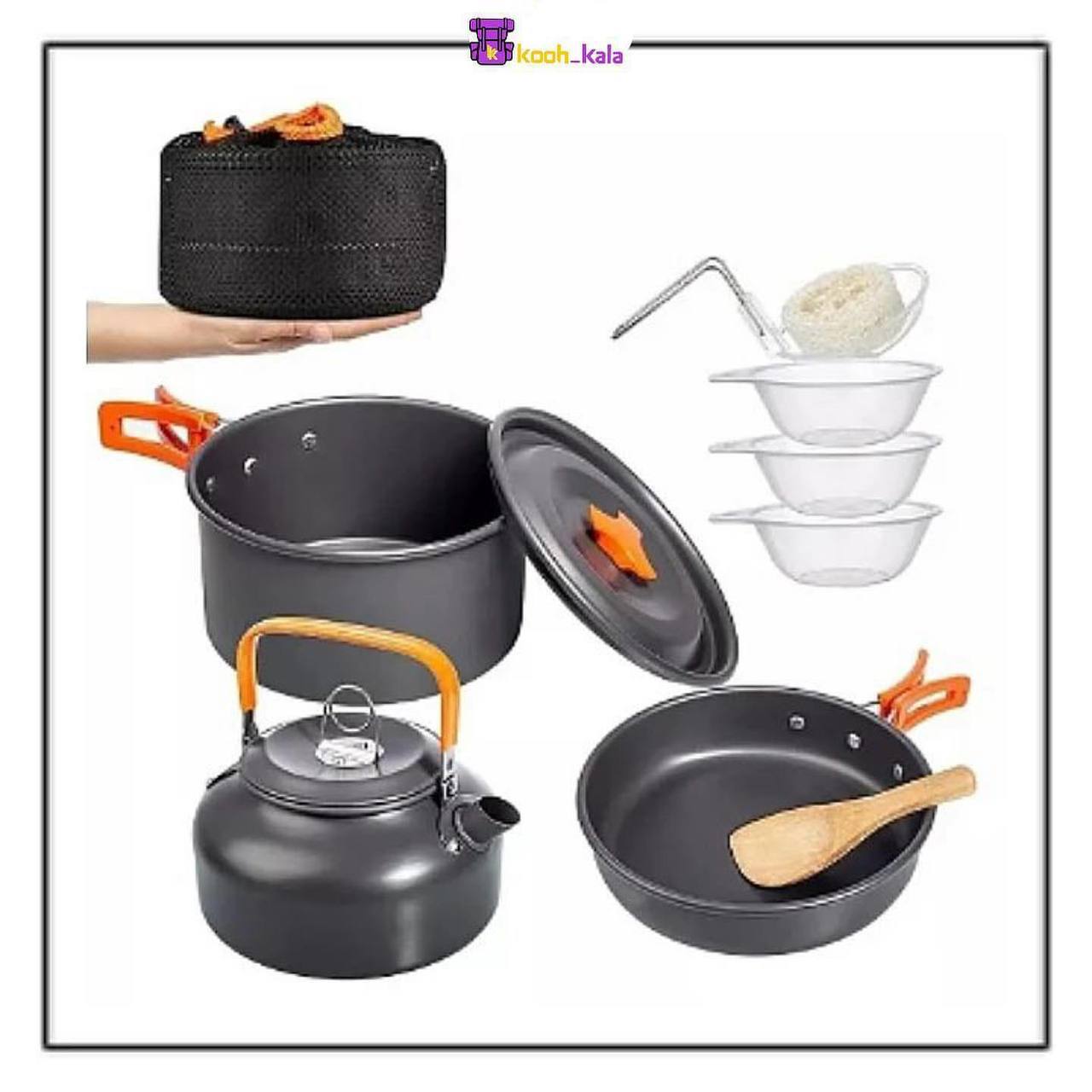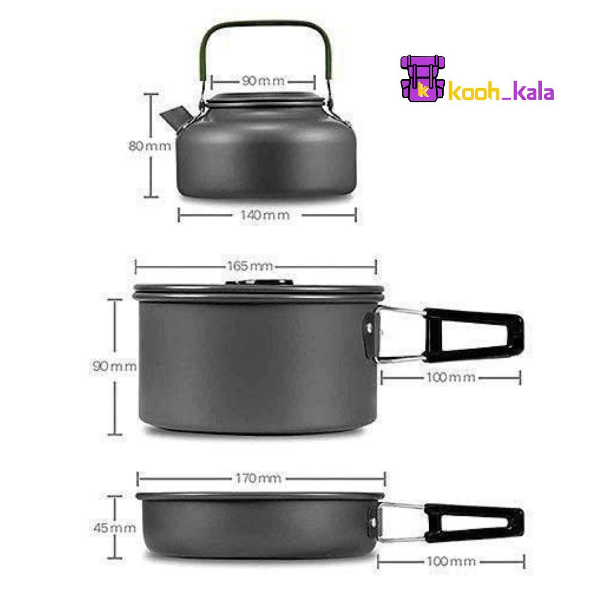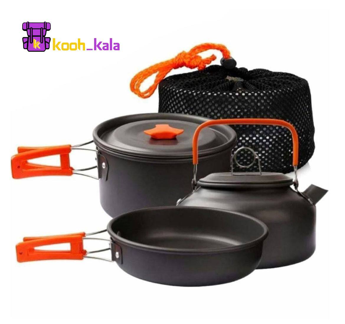 ست ظروف شامل یک قابلمه، یک ماهیتابه و یک کتری است. این ست ۳ تکه مناسب برای ۲ تا ۳ نفر است. دستگیرههای فلزی تاشو با روکش پلاستیکی هستند.